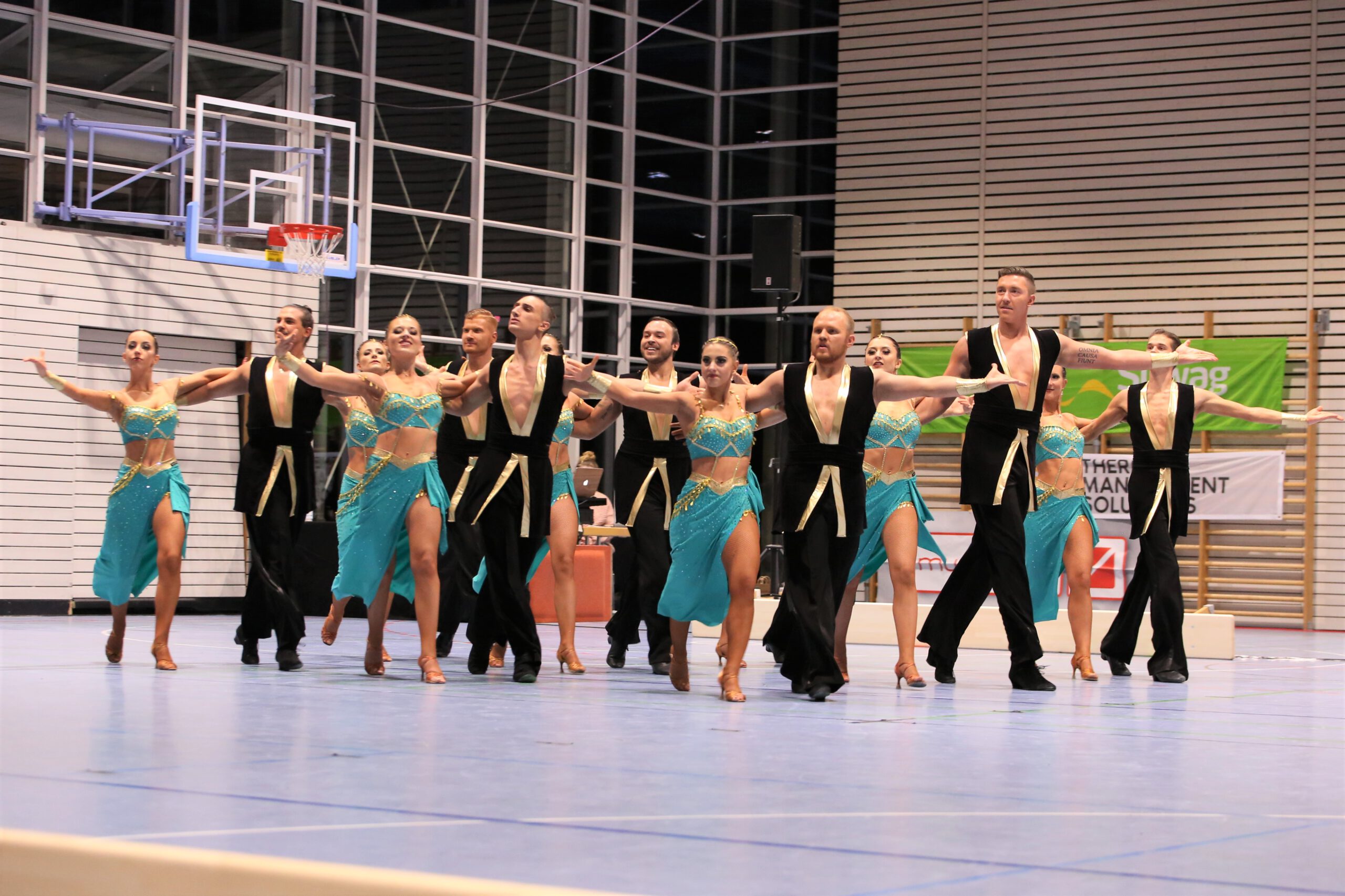 Unser A-Team ist bei jeder Präsentation das absolute Highlight, und dieses Mal gab es für das Publikum eine faustdicke Überraschung: Neue Musik und neue Kleidung. Die Mannschaft entführte uns sowohl visuell als auch musikalisch in das Musical „Aladdin“. Kraftvoll und elegant, das scheint das Motto dieses Teams zu sein, und das Publikum wusste ob der Vielzahl an Bildern, die ihm da innerhalb von etwas mehr als 6 Minuten gezeigt wurde, nicht, womit es als nächstes zu rechnen hat. Die Bilder, die das hervorragend motivierte Team gezeigt hat, zogen sich oftmals über die gesamte Breite der Tanzfläche hin.