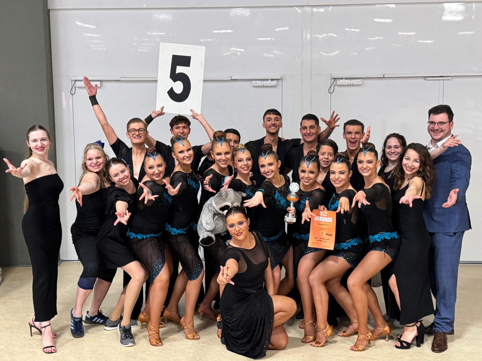 Das Formationswochenende in Waiblingen begann am Samstag mit dem Auftaktturnier der Regionalliga Süd TBW Latein. Dabei zeigte das B-Team mit seiner Choreographie „Arabian Nights“ trotz zur Hälfte neuer Mitglieder eine beeindruckende Vorstellung in der Vorrunde. Aufgrund der starken Konkurrenz reichte es lediglich für das kleine Finale, wo sie mit den Wertungen 7-6-6-5-6 den sechsten Platz erreichten. Das Trainerteam bestehend aus Yannick Herrmann, Matiena Di Nunno und Lena Kiebel zieht daraus wichtige Schlüsse für die Vorbereitung auf das kommende Heimturnier.